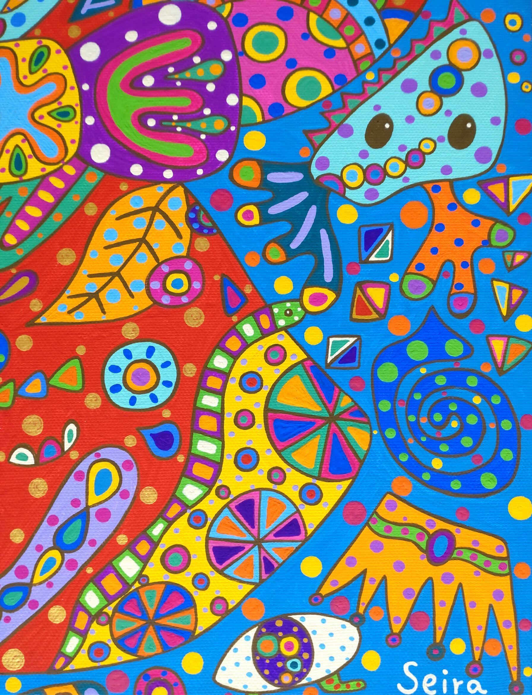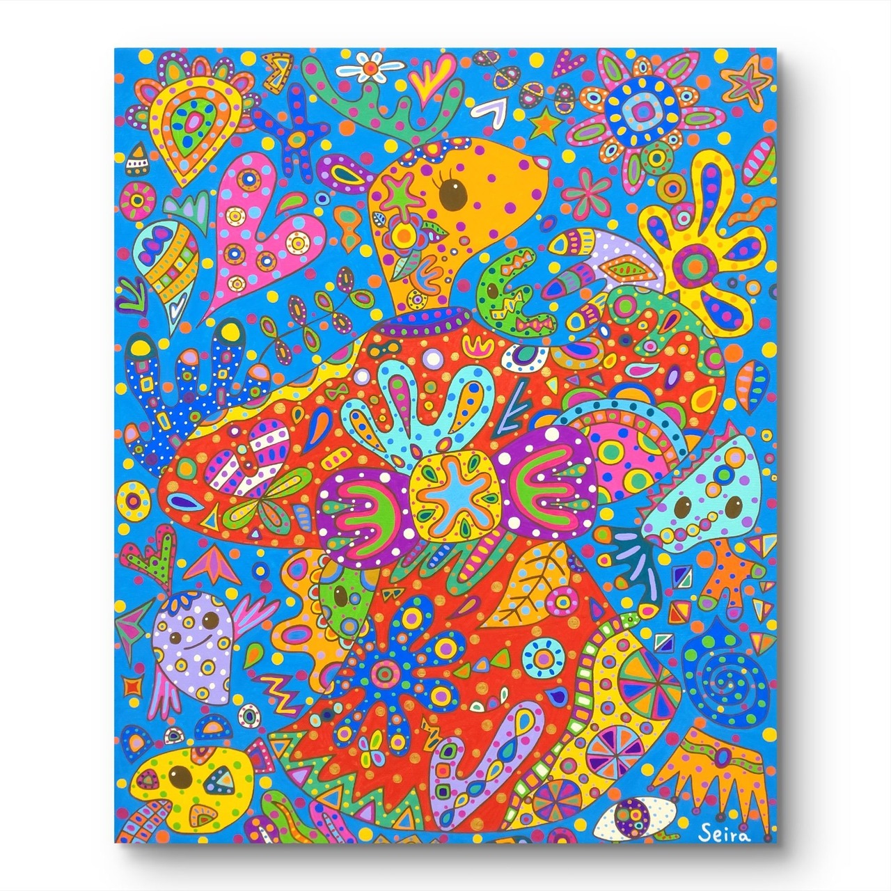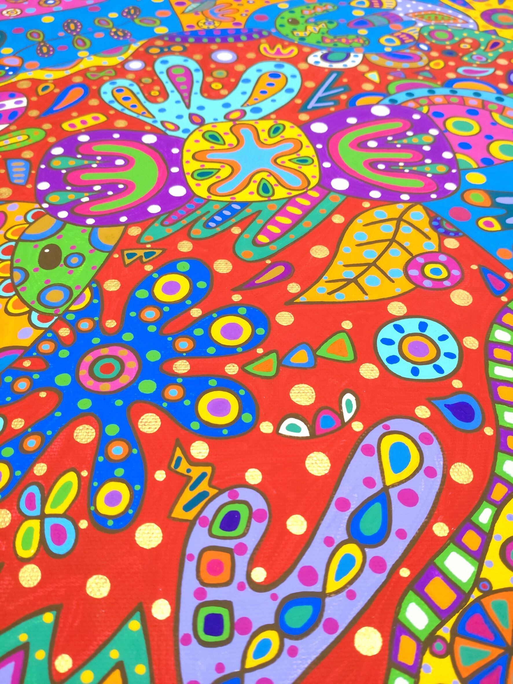 着物を着た鹿が踊っています。鹿が踊るといろいろな生き物や花が生まれていきました。生命(いのち)がいっぱいで、みんながわーいと盛り上がっているところです。着物は金色でドットを描いています。作品のポイントはいろんな生き物がいるところです。