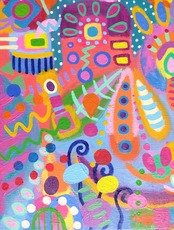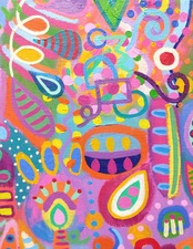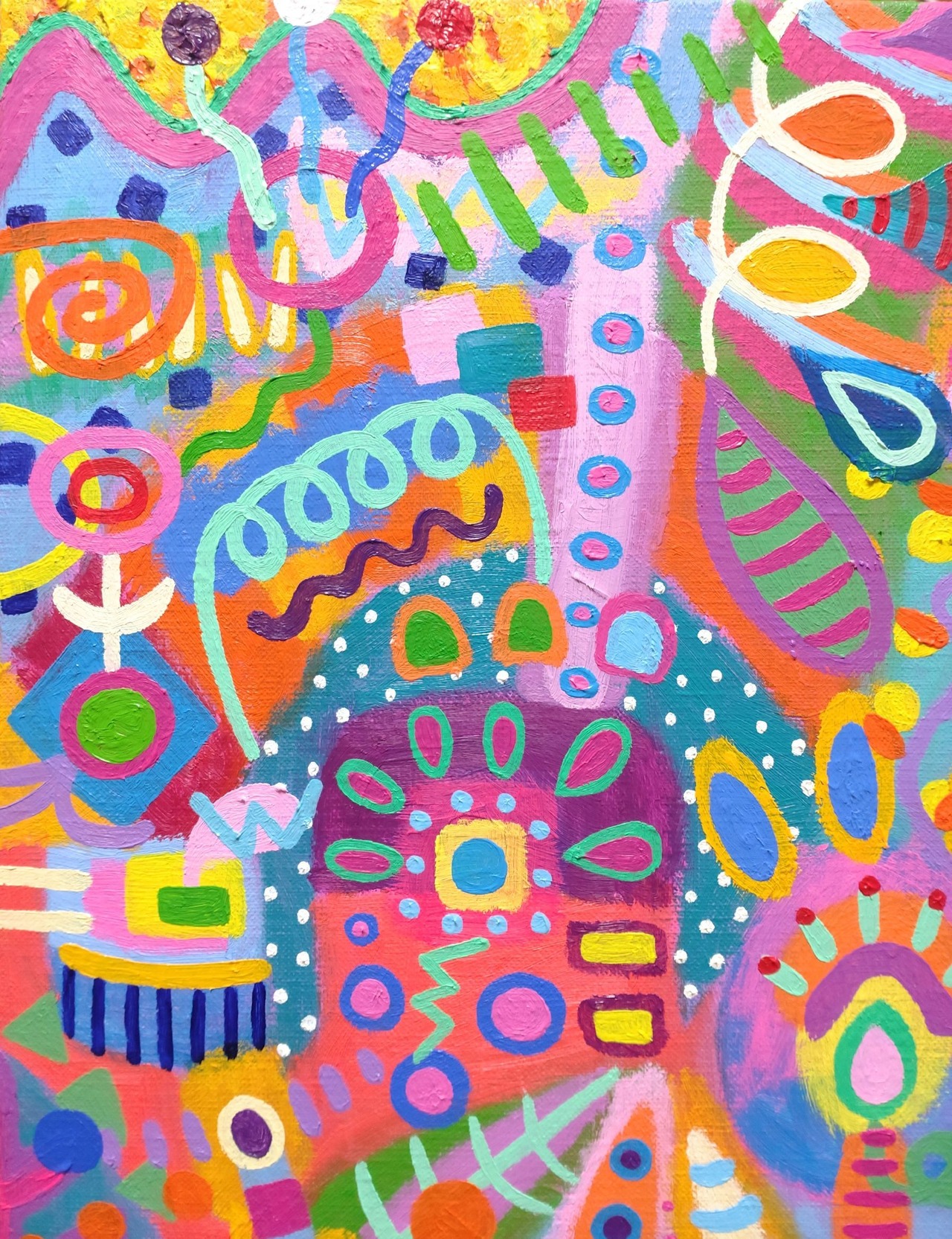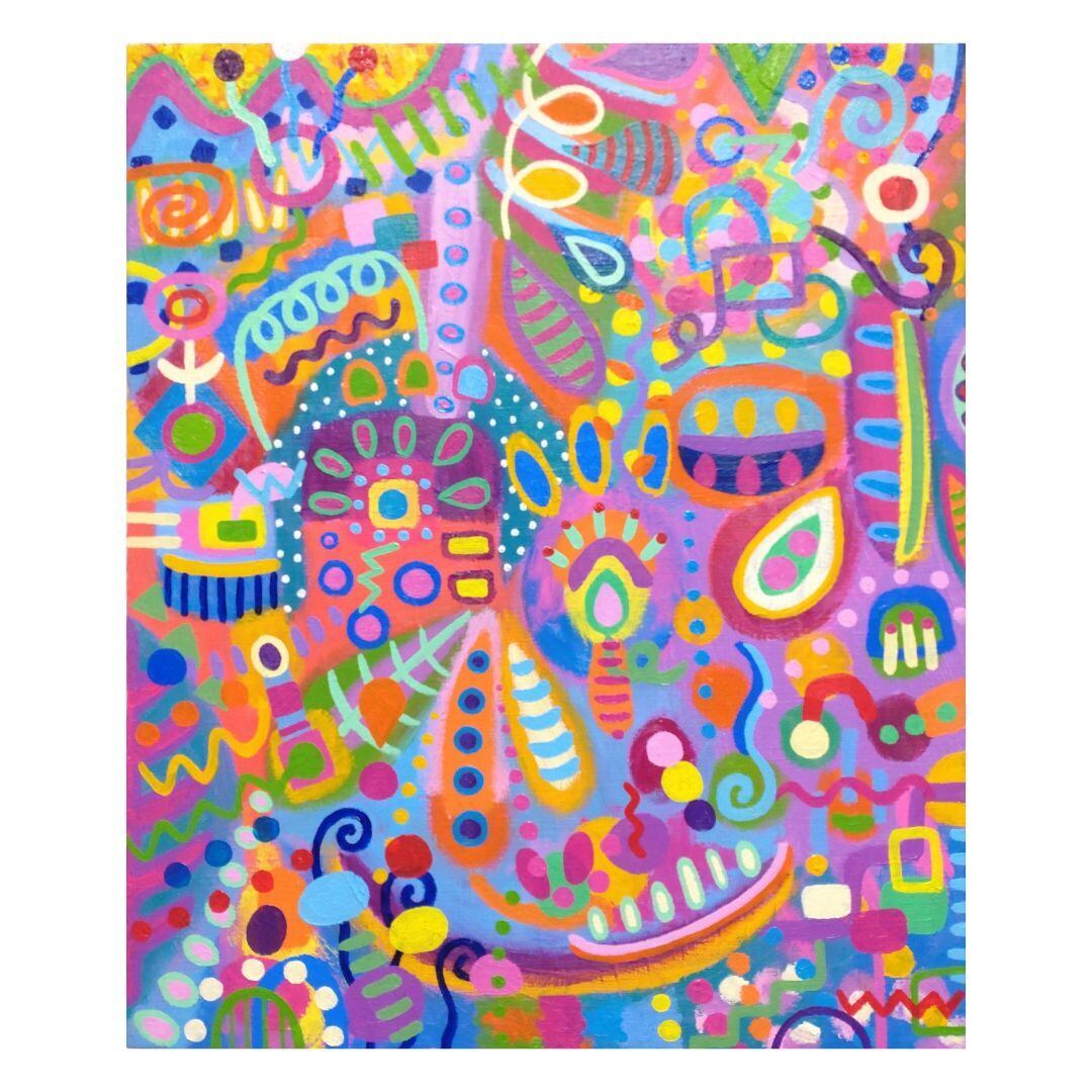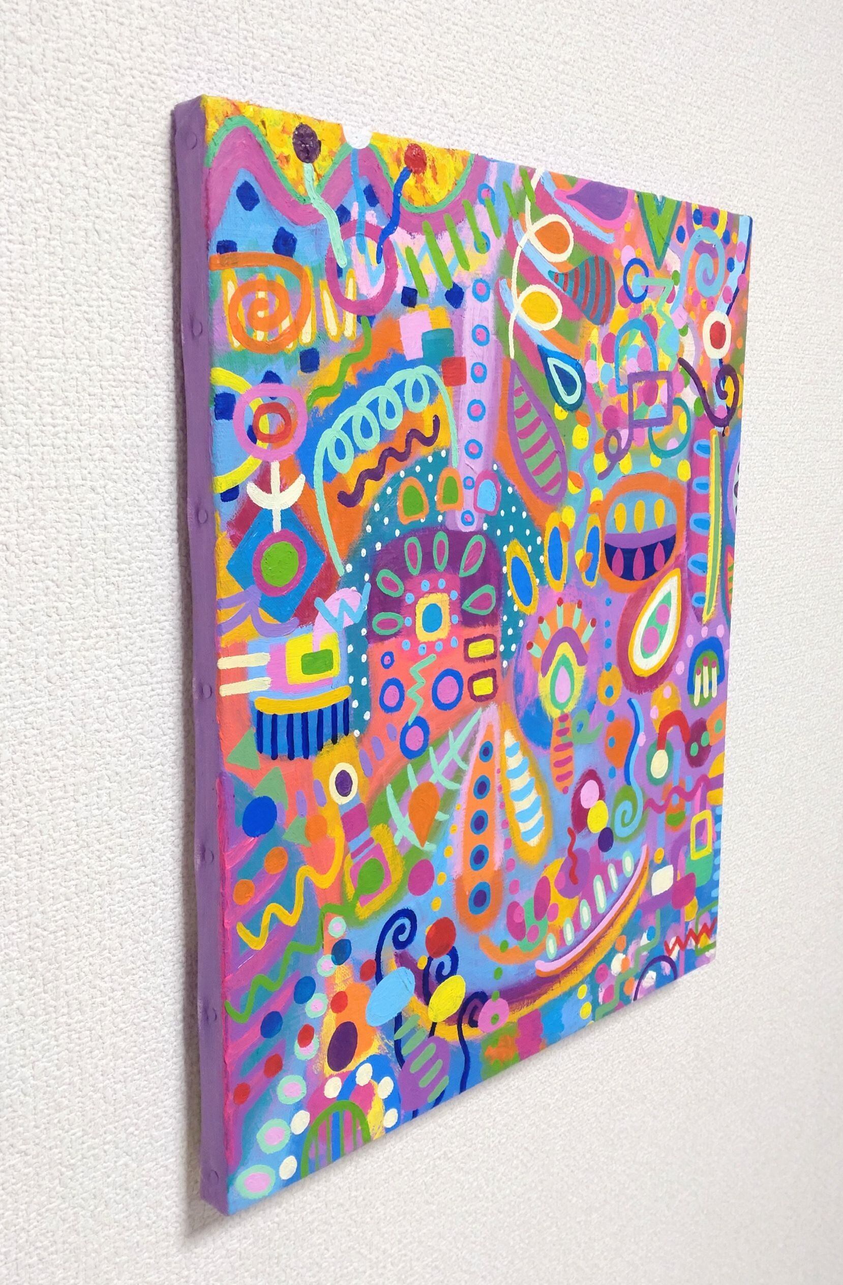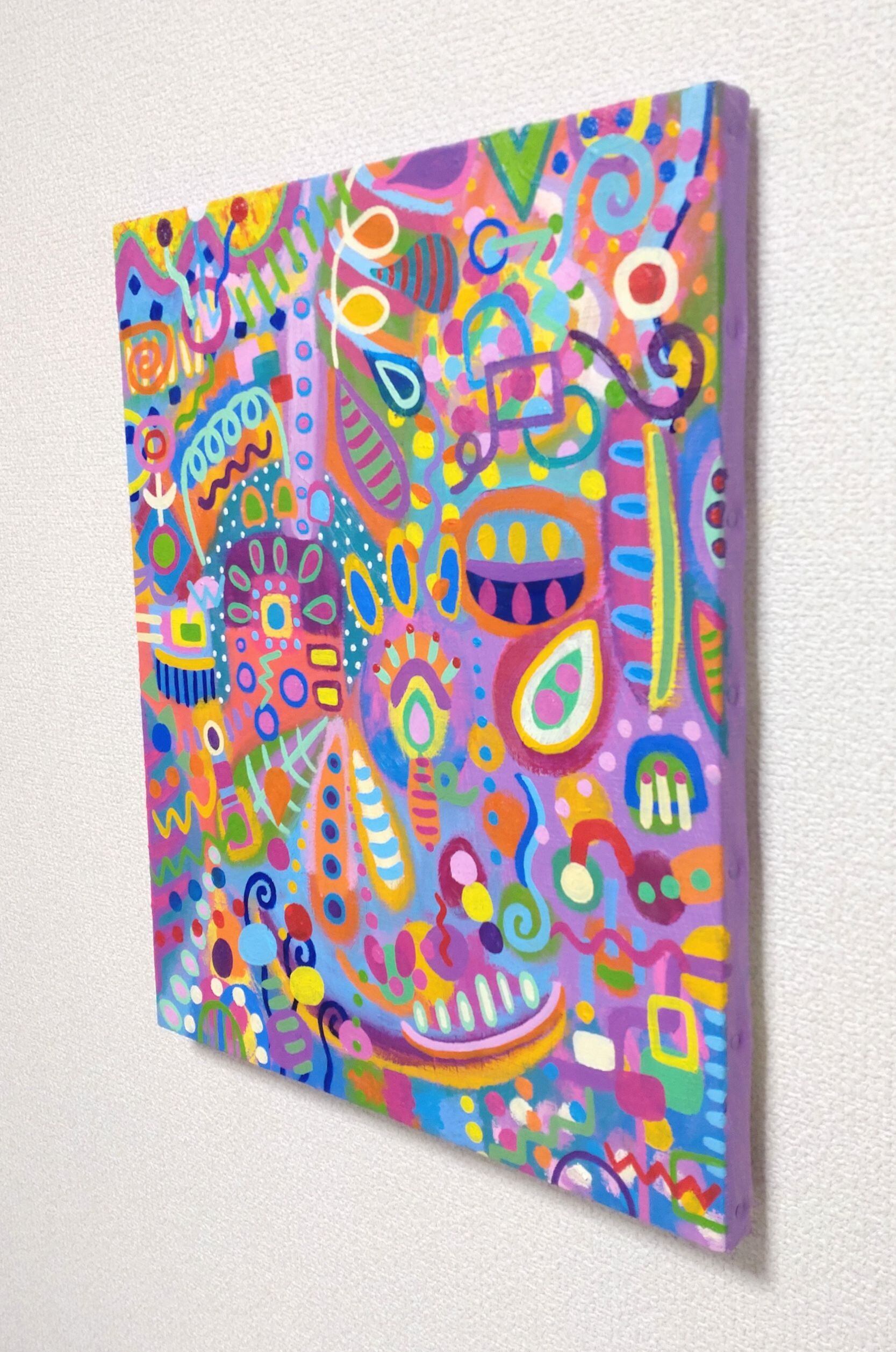 何も考えずに自由に描きました。タイトルは作品完成後に浮かんだものをつけました。いろんな色たちの躍動感や、自由な感じをお楽しみいただけます。わくわくするようなことを作って、毎日が少しでも楽しくなっていくといいなと思います。