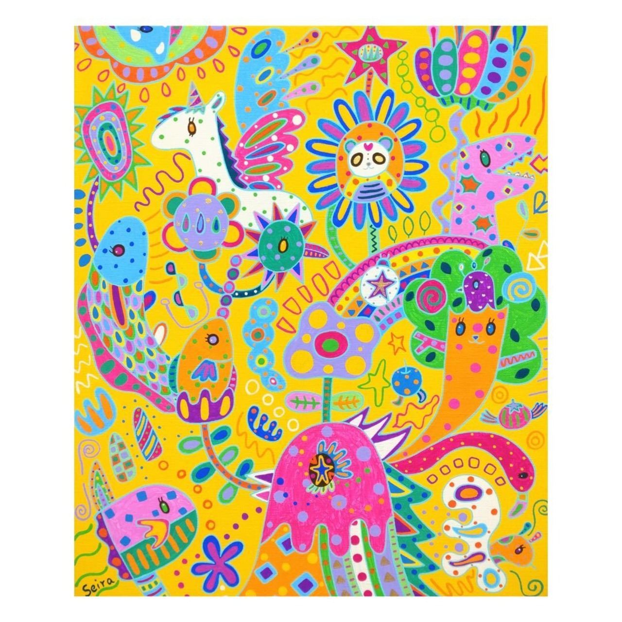 作品下の真ん中にいる鳥が仲間たちを呼んでいるところです。海の生き物(マンボウ、深海魚、魚、イルカ)、キリン、ユニコーン、恐竜、パンダ、フラミンゴ、木などがいます。みんなを呼んでいる鳥は、明るくてみんなの中心的な存在です。