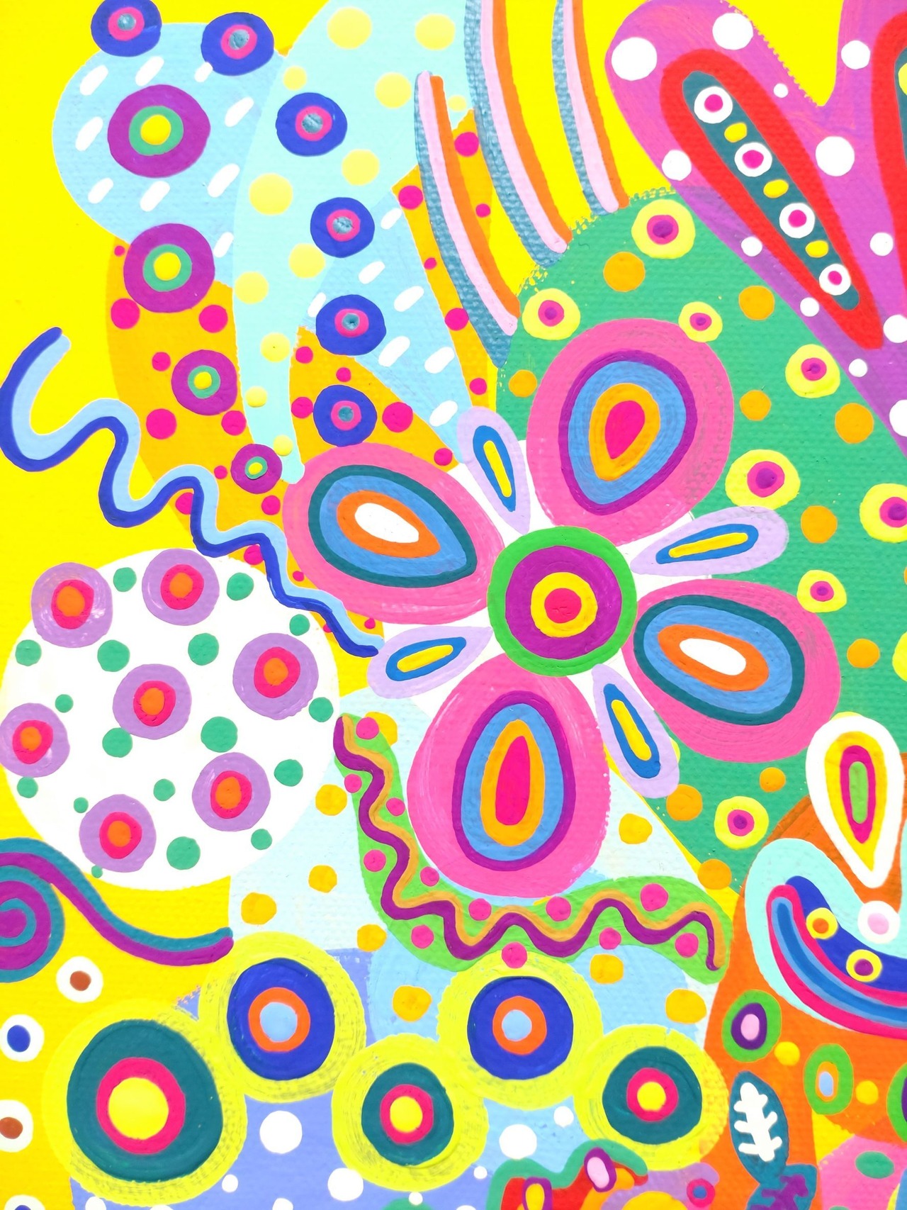 いろんな花たちがわーっと咲いているところです。生きていると調子のいいときやそうではないときなどいろいろあります。どんなときもあなたに寄り添って見守ってくれて励ましてくれるそんな友達みたいな感じの作品です。